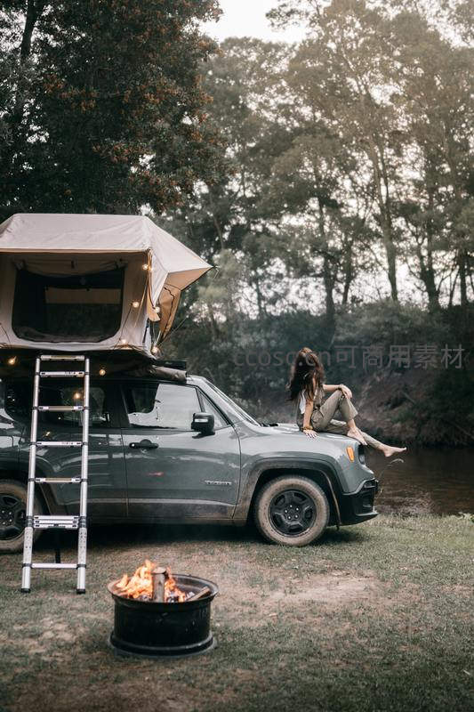 一辆灰色越野车停在幽静树林边,车顶搭起帐篷,女子悠闲地坐在车头,脚边篝火正旺,营造出远离尘嚣的野奢露营体验。