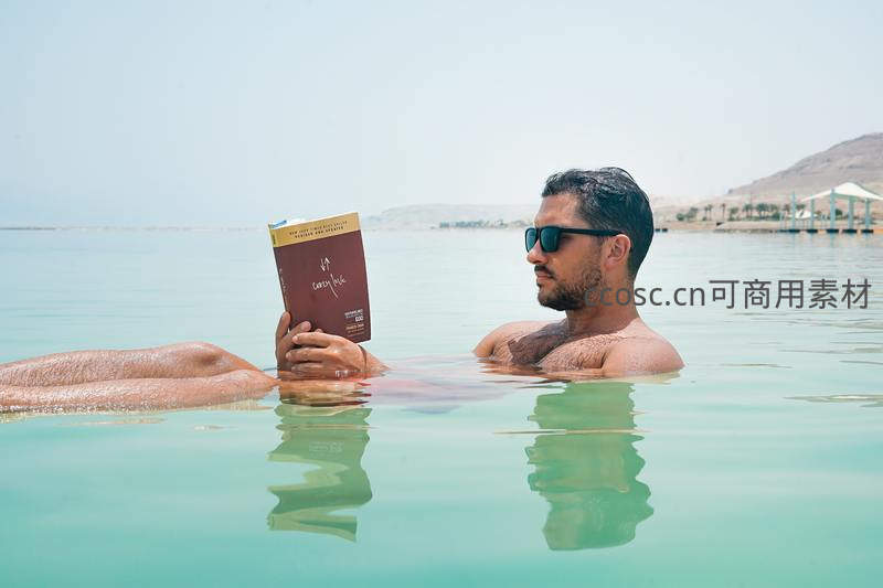 男子在碧绿的死海中悠闲漂浮,戴着墨镜专注阅读。独特的高盐度让他轻松浮于水面,背景是干燥的山丘与晴朗天空,尽显自然奇迹与个人宁静。
