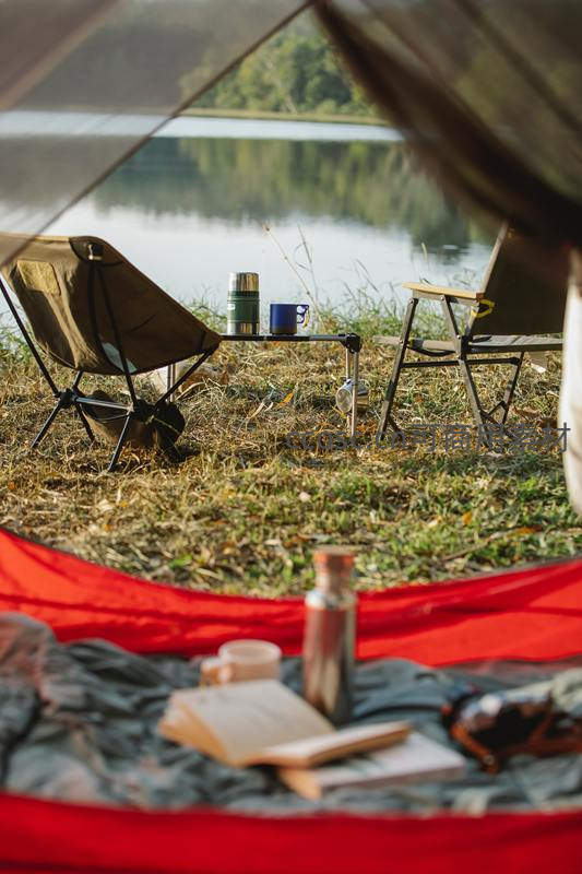 从帐篷内向外望去,湖水如镜,两把折叠椅与小桌摆放整齐,保温杯和咖啡杯静待享用,地上摊开的书页与水壶,诉说着慢生活的诗意。
