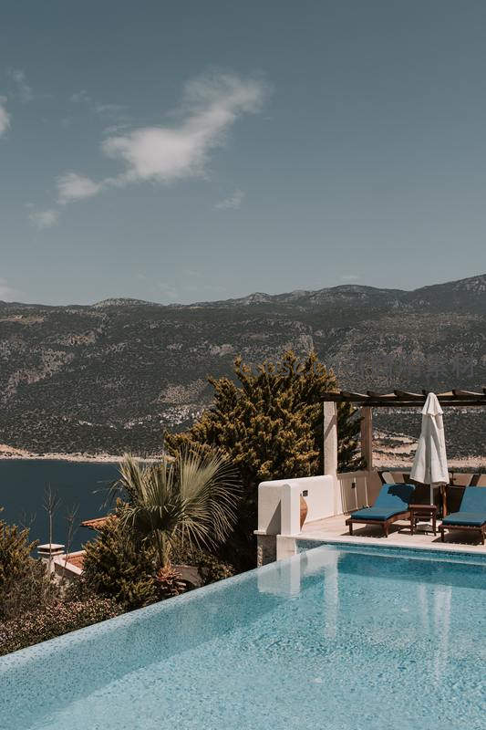 清澈的无边泳池与远处的蔚蓝大海和连绵山脉融为一体,白色建筑与绿植点缀其间,营造出宁静奢华的度假氛围。