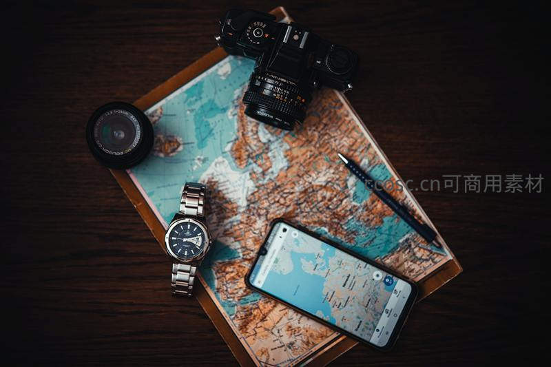 复古地图上摆放着胶片相机、金属表带腕表、智能手机与钢笔,暗调木纹背景烘托出精心策划下一次冒险旅程的静谧氛围。