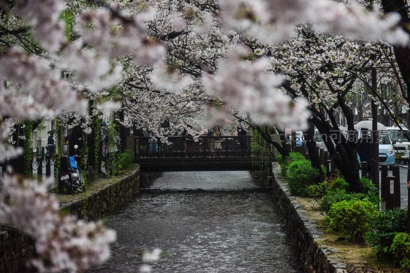 春日里,粉白樱花如云般覆盖在运河两岸,石砌河岸与古朴小桥相映成趣,游人撑伞缓步,静谧而诗意。