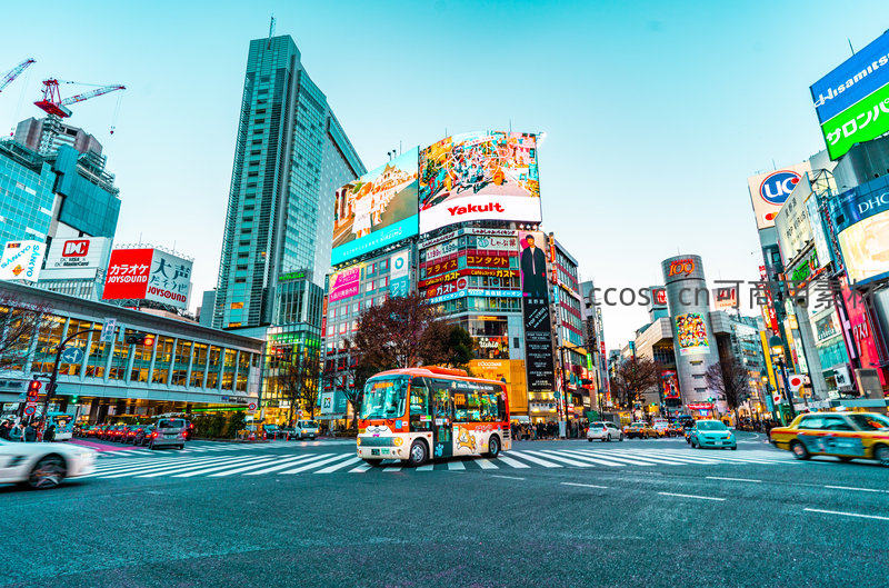 晴空下的涩谷十字路口,巴士穿行楼宇间