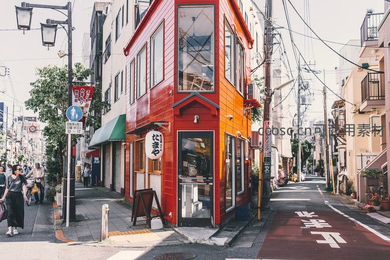 阳光洒在街角一栋鲜艳的红色日式建筑上,行人悠闲走过,充满生活气息的城市街景令人倍感亲切与宁静。