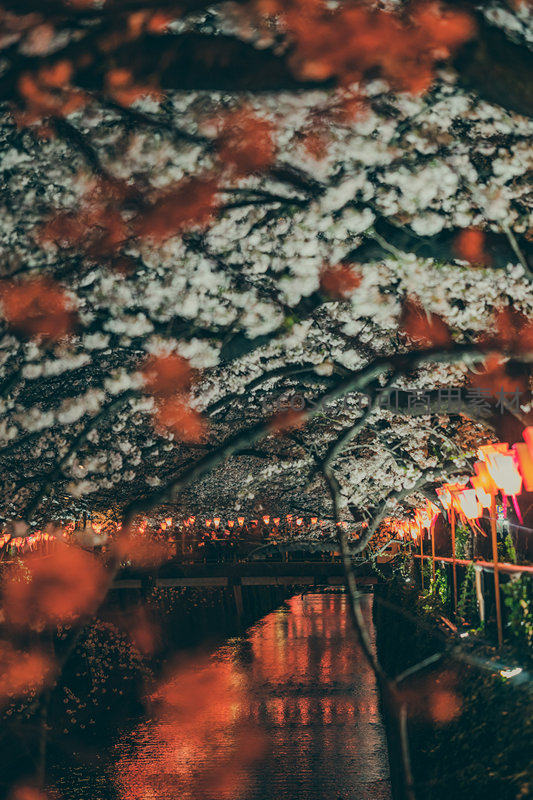 繁花似锦的樱花枝条形成天然隧道,暖光灯笼点缀其间,水面波光粼粼,宛如步入童话中的春夜秘境。