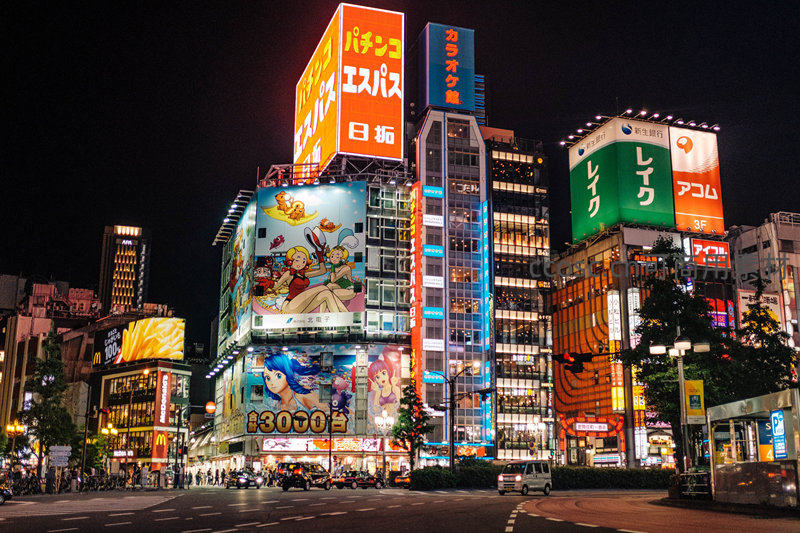 涩谷十字路口的高楼大厦被巨大的彩色LED广告牌点亮,动漫角色与品牌标识交相辉映,展现了东京作为全球科技与潮流中心的现代魅力。