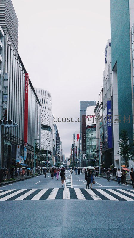 宽阔的城市主干道上,行人撑着伞穿过斑马线,两旁林立着现代化的摩天大楼和巨型广告牌,展现了大都市的繁忙、现代与活力。