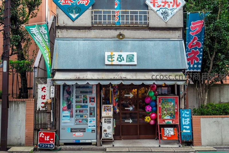 一家典型的日本街角小店,门前摆满自动售货机和彩色气球,五彩斑斓的招牌与陈旧的建筑形成对比,弥漫着浓厚的生活气息。