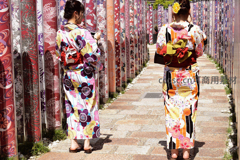 和服女子漫步间,花墙夹道影成双