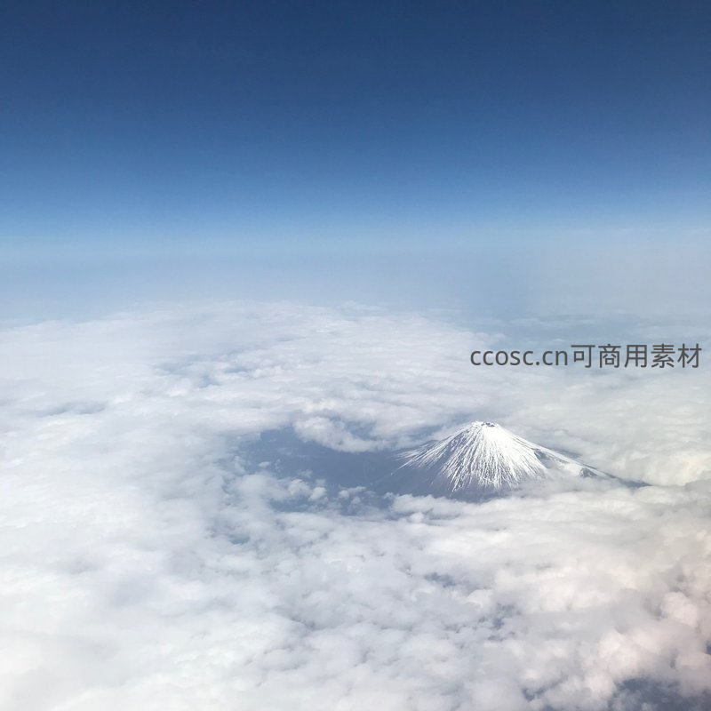 从高空俯瞰,雄伟的富士山雪顶穿透层层白云,与湛蓝天空相接,展现大自然的壮丽与纯净,令人心旷神怡。