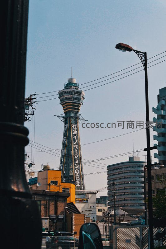 从街角仰望,日立塔巍然屹立于楼宇之间,结构清晰,广告牌醒目,周围电线交错,呈现出典型日本都市的工业与生活交织景象。