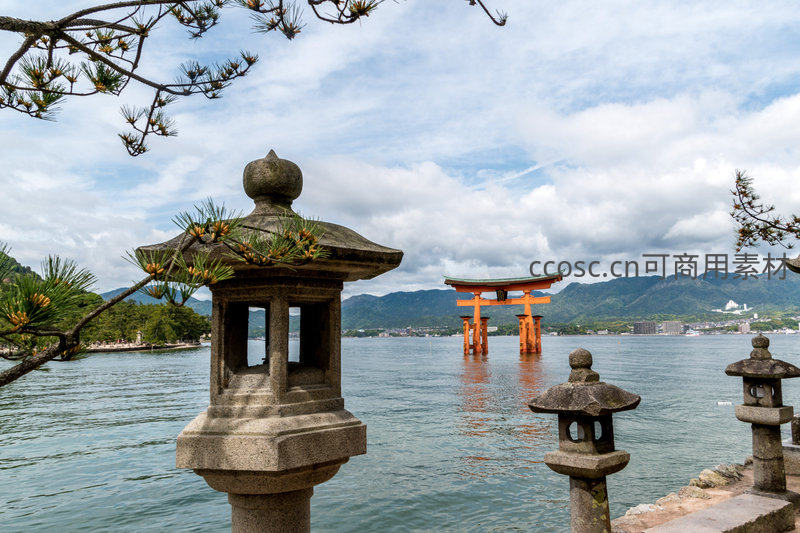 橙红色的巨型鸟居矗立于碧波荡漾的海面之上,前景是古朴的石灯笼,远处青山环绕,构成一幅标志性的日本宗教圣地画卷。