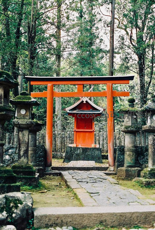 鲜红的鸟居矗立于苍翠密林之间,石阶蜿蜒通向小型神社,苔藓覆盖的石灯笼守护着这片神圣静谧之地。