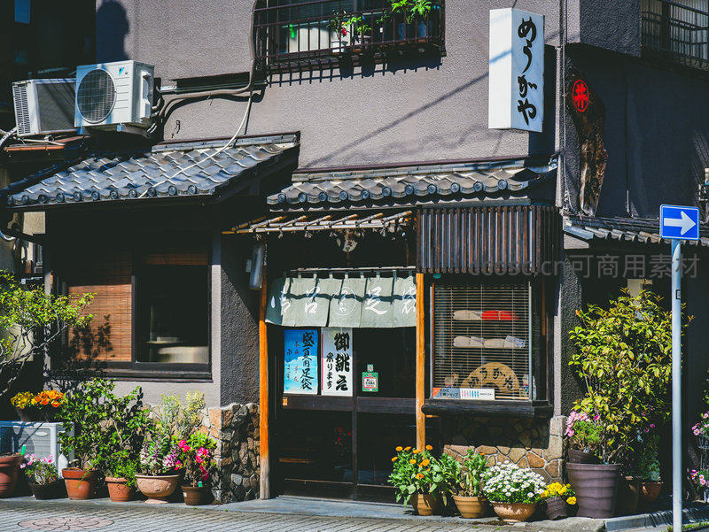 一家古朴的日式小店门前摆放着各色盆栽花卉,青瓦屋檐与木质门面相映成趣,阳光洒落,营造出温馨静谧的街角生活氛围。
