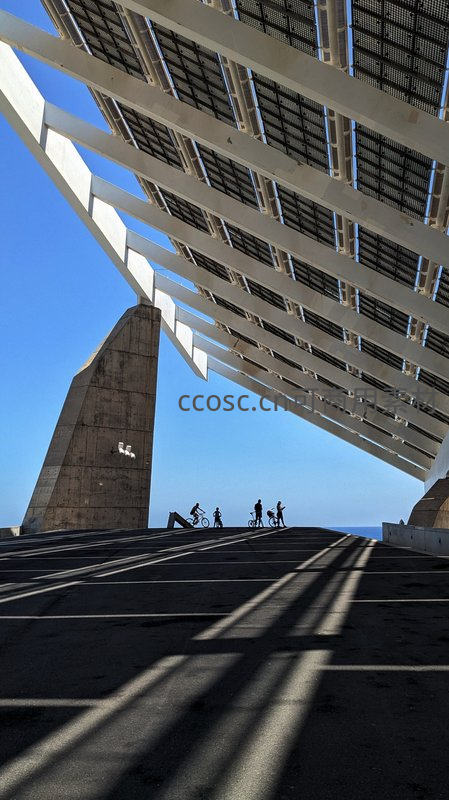 在巨大现代建筑的白色遮阳板下,几位骑行者的剪影在阳光投射的条纹阴影中穿行,蓝天为背景,展现活力与建筑美学的和谐交融。