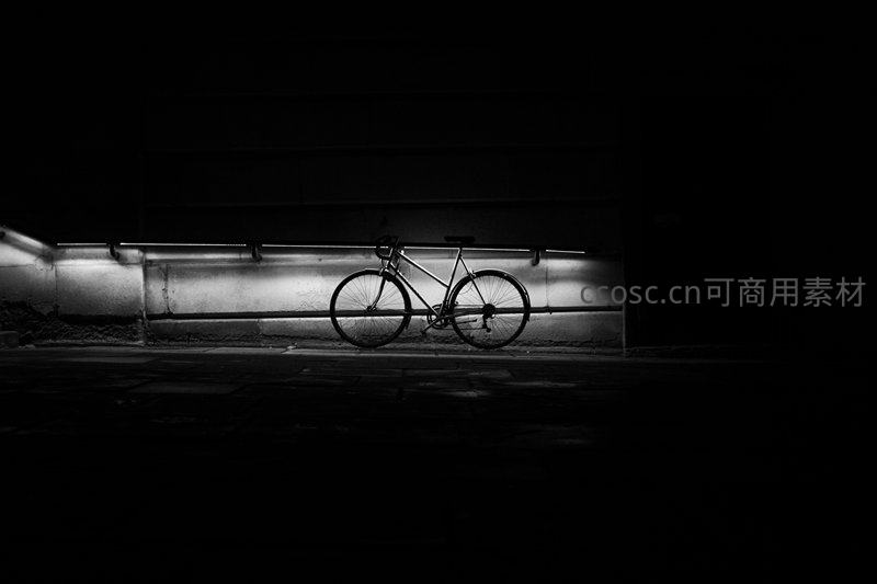 一盏长条灯带斜照在水泥墙边,一辆复古公路自行车静静倚靠,车身轮廓在强光下清晰凸显,四周沉入深邃黑暗,营造出强烈的明暗对比与寂寥氛围,展现都市夜晚的静谧美学。