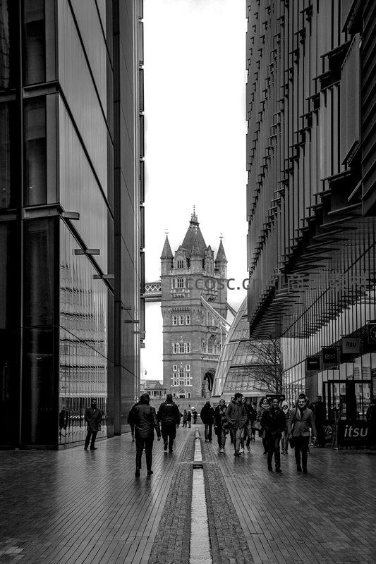 两侧高耸玻璃幕墙形成视觉隧道,中央狭长通道尽头矗立伦敦塔桥标志性塔楼,行人穿梭其间,地面湿滑反光,强烈透视与明暗节奏突显城市空间张力与历史层叠感。