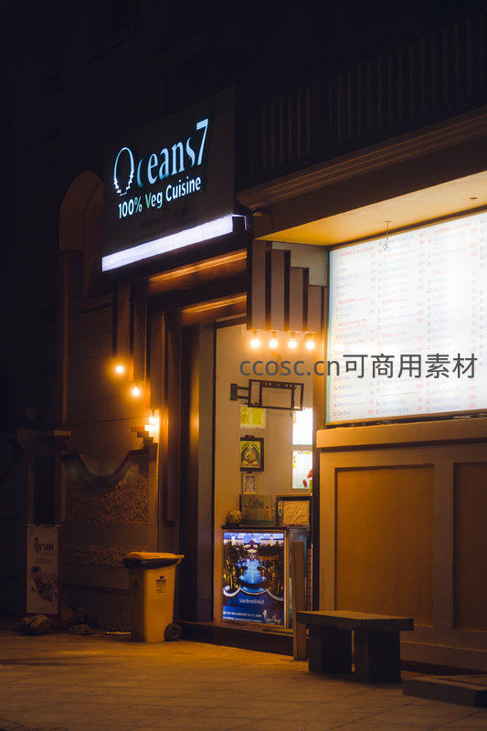 一家名为Oceans7的素食餐厅在夜色中亮起温暖的灯光,招牌醒目,门前空无一人,营造出静谧而诱人的氛围。