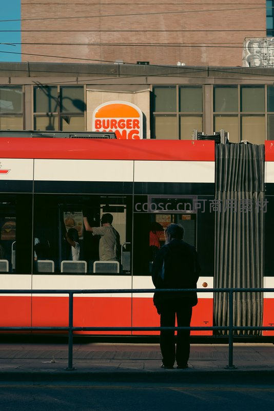 一位行人在红色电车旁静静伫立,背景是醒目的汉堡王广告牌,城市生活的瞬间被定格,充满故事感。