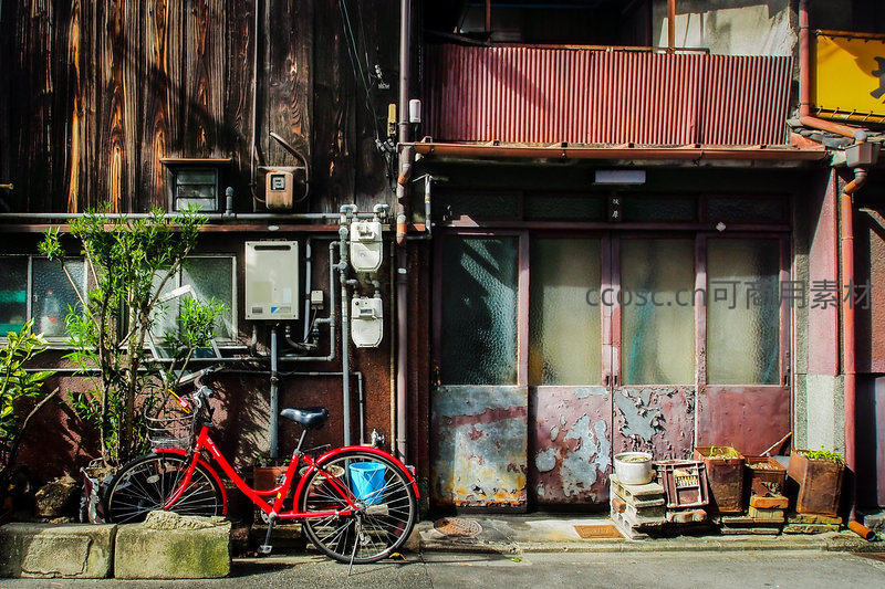 一辆鲜红的自行车倚靠在斑驳的木质老屋前,阳光洒落,绿植点缀,展现日式小巷独有的宁静与岁月痕迹。