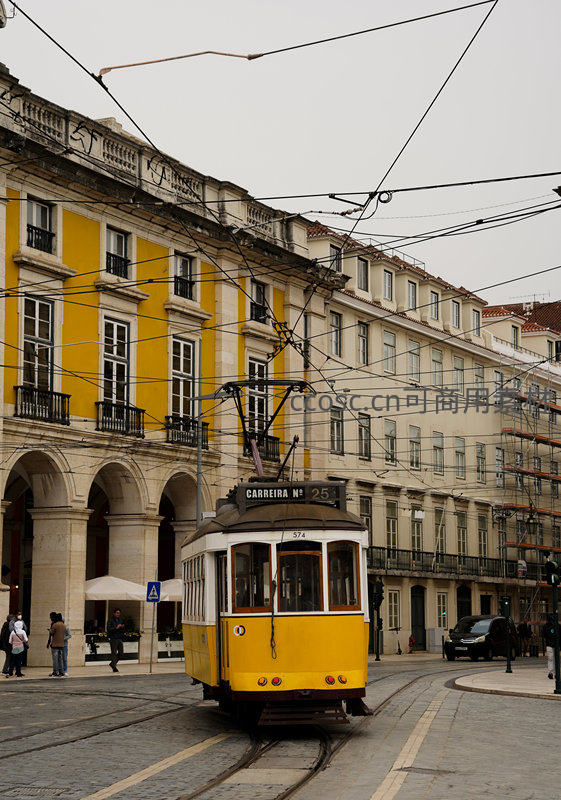 一辆标志性的黄色有轨电车缓缓驶过铺满石块的街道,两旁是拥有拱廊和雕花窗框的古典建筑,空中纵横交错的电缆线勾勒出浓郁的欧洲城市韵味。