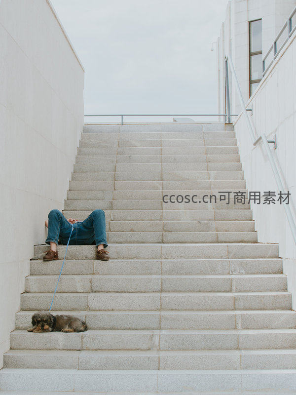一个人慵懒地躺在宽阔的白色石阶上,脚边卧着一只可爱的小狗,一人一宠共享片刻宁静,画面充满生活气息与温馨感。
