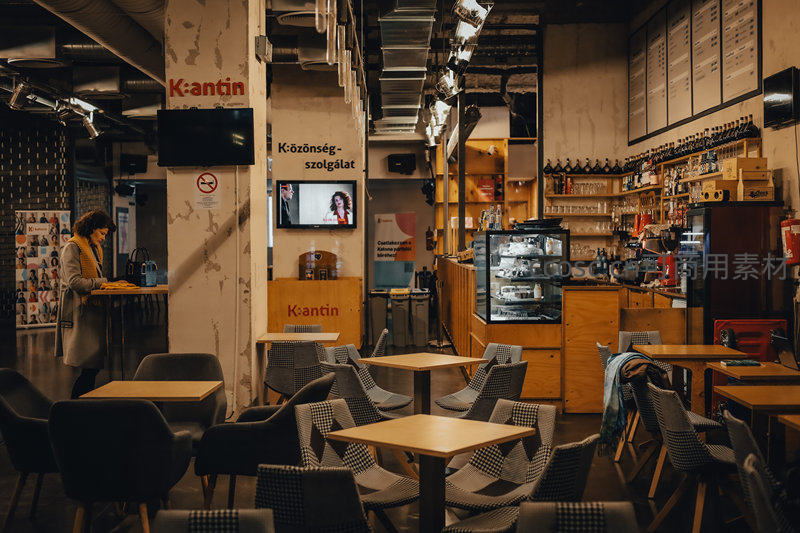 宽敞明亮的咖啡馆内,木质桌椅与工业风装饰相得益彰,顾客安静阅读,营造出舒适惬意的都市休闲空间,适合放松与社交。