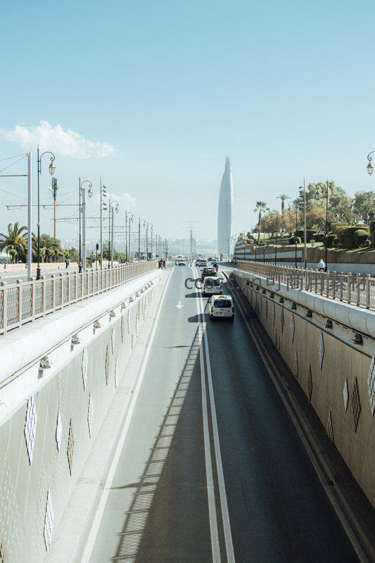 晴朗天气下,车辆在宽阔的城市高架桥上有序行驶,远处摩天大楼耸立,两侧绿树成荫,构成一幅充满活力与秩序感的现代都市交通图景。