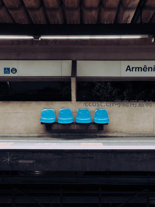 空荡地铁站台的蓝色座椅