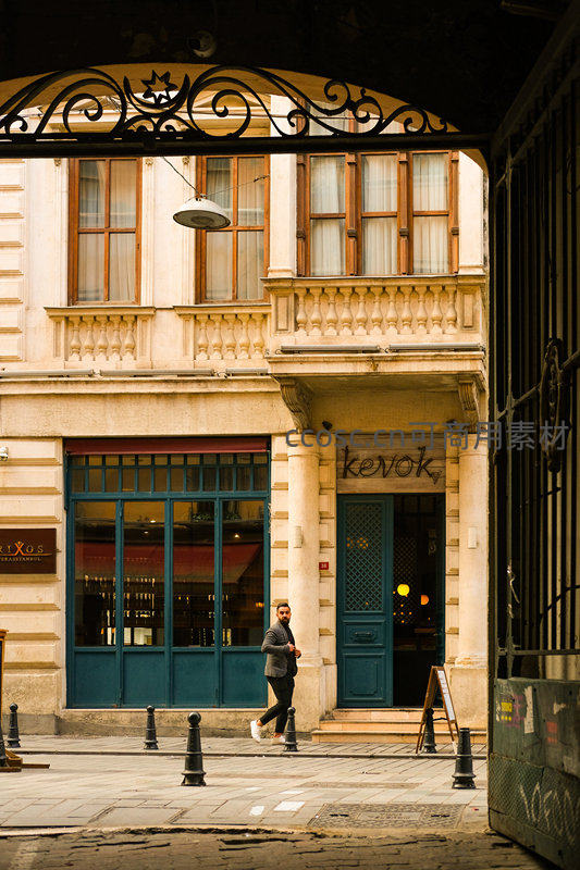 透过精美的铁艺拱门,一位男士走过拥有古典立面和蓝色门窗的欧式建筑前,店铺招牌隐约可见,阳光洒落,定格了欧洲老城悠闲的一刻。