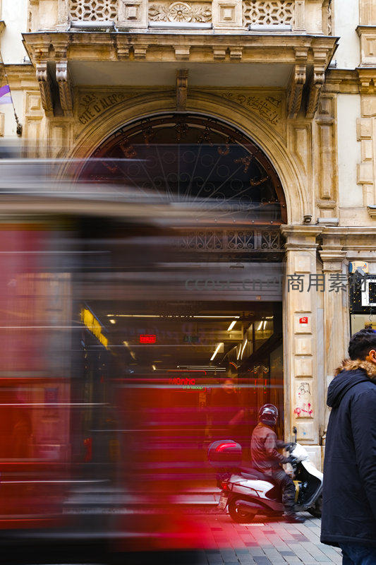 一辆红色车辆快速驶过,留下一道模糊的光影,背景是精美的古典石拱门,行人与摩托车静止其中,动静对比强烈,充满都市生活气息。