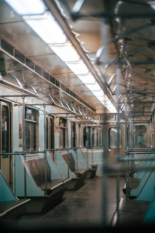 空无一人的地铁车厢,头顶冷白灯光照亮整条过道,两侧整齐排列的座椅和扶手在光影中延伸,营造出一种未来感与寂寥并存的工业美学。
