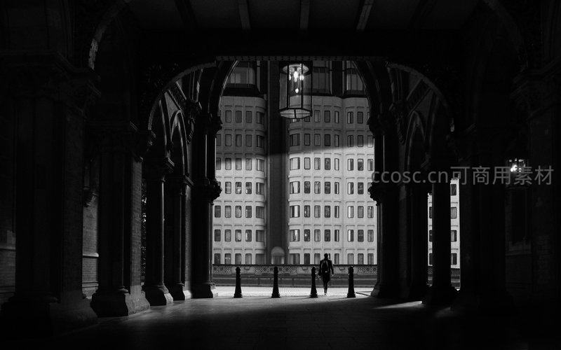 在古典拱廊的深邃阴影中,一个孤独的身影走向远方的现代高楼,强烈的明暗对比与建筑结构形成视觉张力,展现时空交错的艺术美感。