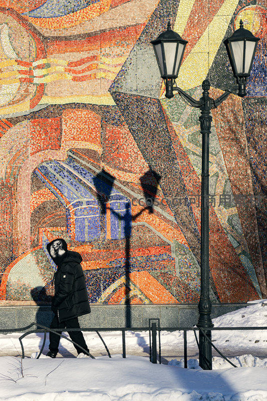 冬日雪地上,一位行人匆匆走过一面巨大的彩色马赛克壁画墙,黑色路灯投下长长影子,冷暖色调交织,构成一幅充满艺术感的城市冬日图景。