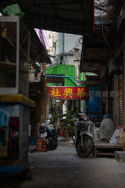 狭窄巷道内停放着几辆摩托车,上方悬挂着红底黄字的“社興華”招牌,电线交错,充满地道市井生活气息。