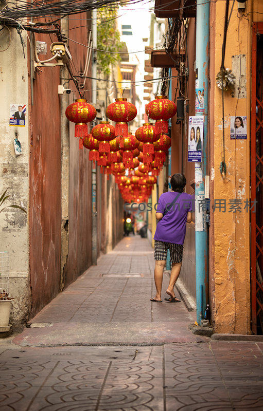 一条狭窄的巷子里挂满了喜庆的红色灯笼,一位身穿紫色上衣的行人背对镜头,正驻足欣赏这充满节日氛围的街景,两侧是斑驳的老墙。