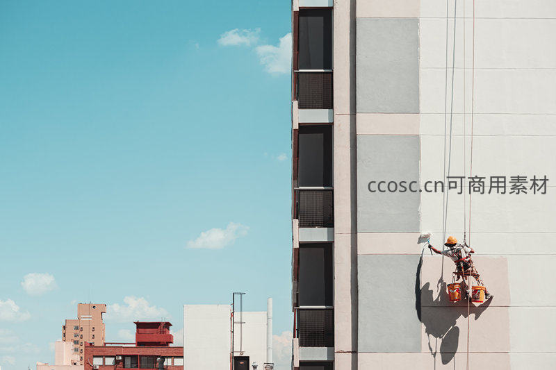 高空作业工人粉刷高楼外墙