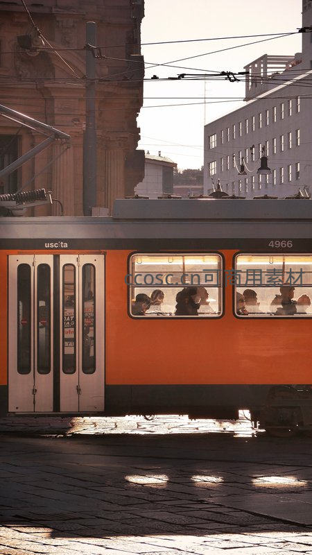 一列橙色电车缓缓驶过铺满石板的古老街道,车内乘客清晰可见,暖光透过窗户洒落,勾勒出欧洲城市温暖而怀旧的生活画卷。