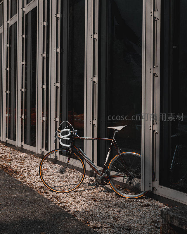一辆设计精美的公路自行车倚靠在具有金属质感的现代建筑外墙旁,地面散落着落叶,光影交错,展现出都市中的一抹简约与精致的生活态度。