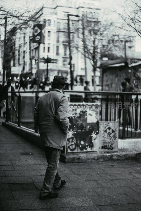 一名戴着帽子的男子背对镜头走在城市街头,身旁是贴满涂鸦的广告牌和模糊的行人,黑白影像赋予画面浓厚的故事感与怀旧情绪,捕捉日常瞬间。