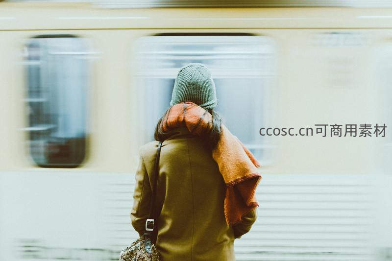 一位戴着针织帽、围着围巾的女子站在站台上,背景是快速驶过的列车,模糊的动态效果突显了都市生活的匆忙与个体的静止瞬间。