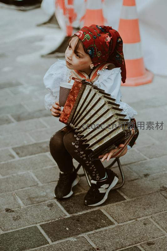 小女孩身着民族风服饰,坐在街边小凳上,一手握咖啡杯,一手轻抚手风琴,神情专注又充满生活气息。