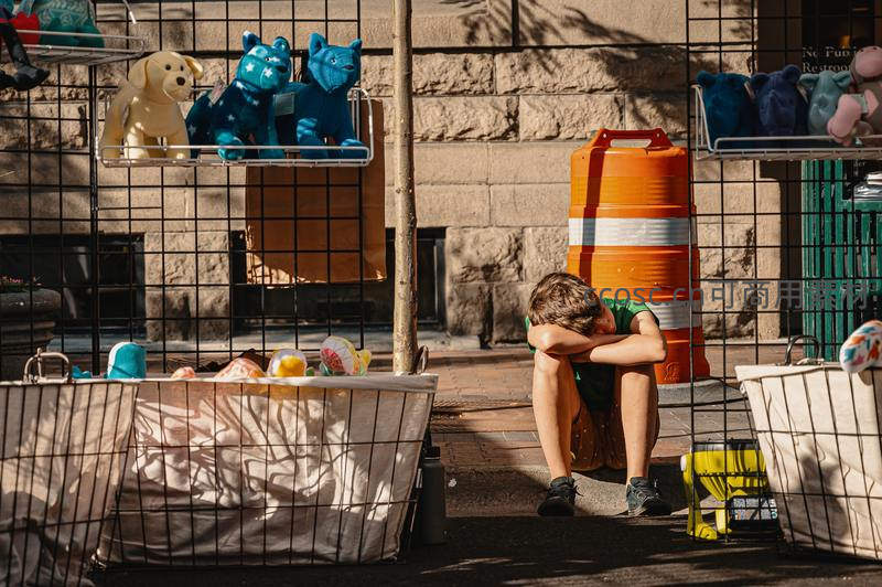阳光透过铁丝网洒在市集角落,少年抱膝蹲坐于橙色路障旁,周围散落玩具,神情若有所思,充满故事感。