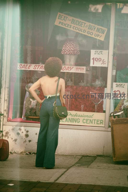 一位留着爆炸头、身穿喇叭裤的女子背对镜头,凝视着充满70年代风格的商店橱窗,广告牌上写着“SALE STARTS TODAY”,充满怀旧感。