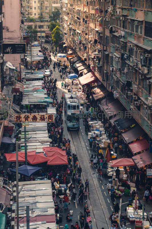 从高处俯瞰,一辆标志性的双层电车缓缓驶过拥挤的街市,两旁是鳞次栉比的商铺和密集的人群,生动展现了香港独特的市井活力与城市肌理。