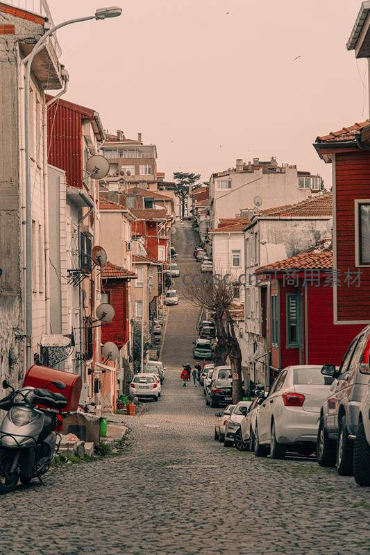 一条铺满鹅卵石的陡峭街道,两旁是色彩鲜明的住宅楼,车辆沿街停放,行人点缀其间,展现出充满生活气息的欧洲小镇风情。