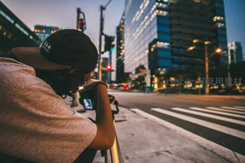 街角摄影师专注取景,摩天楼群辉映夜幕