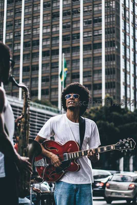 一位戴着墨镜的街头音乐家在高楼前弹奏红色电吉他,神情陶醉,背景中飘扬的巴西国旗和车流衬托出城市公共空间中的艺术与生活交融。