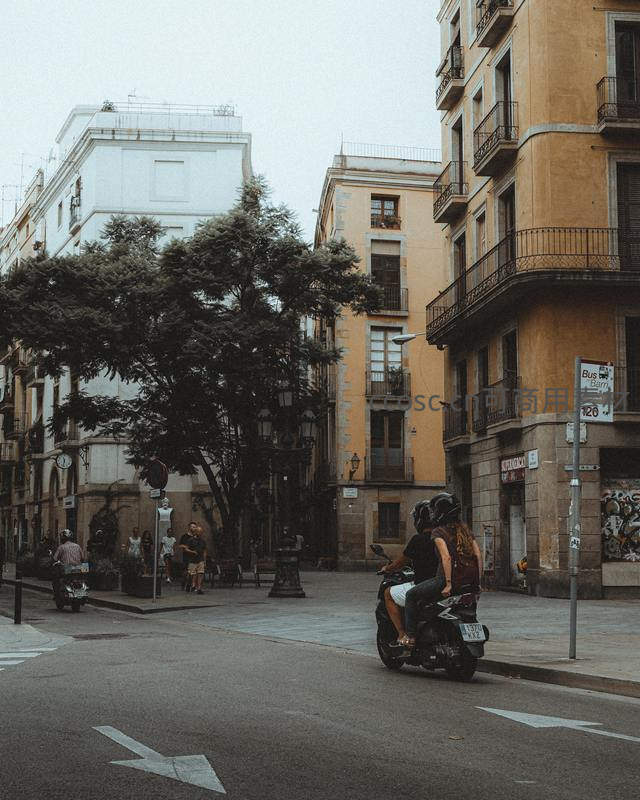 欧洲街角,情侣骑摩托穿行于老建筑之间