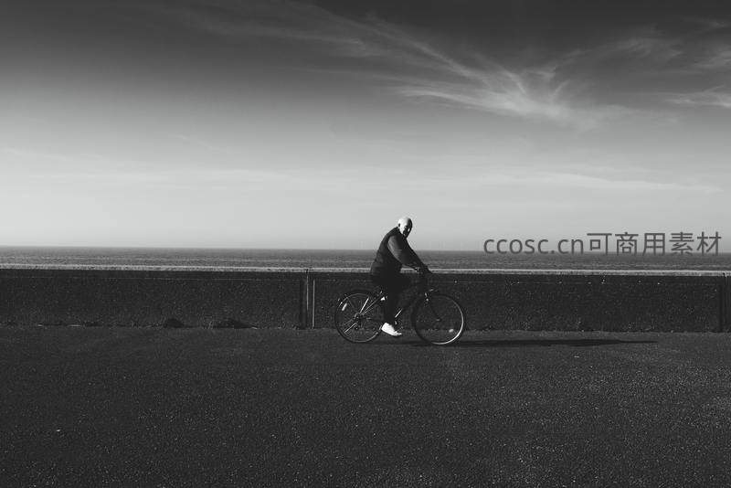 一幅极简风格的黑白照片,一位骑行者沿着海边堤道前行,广阔无垠的海天背景衬托出人物的渺小与宁静,传递出自由与沉思的意境。